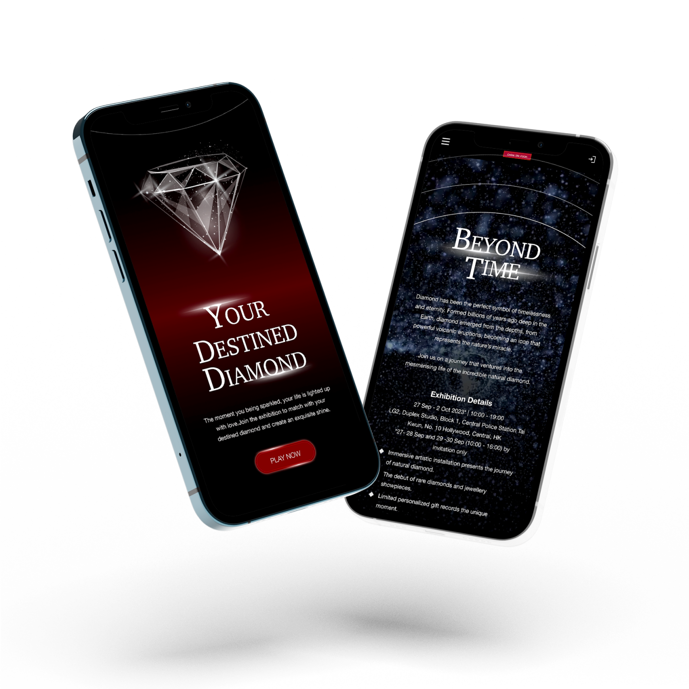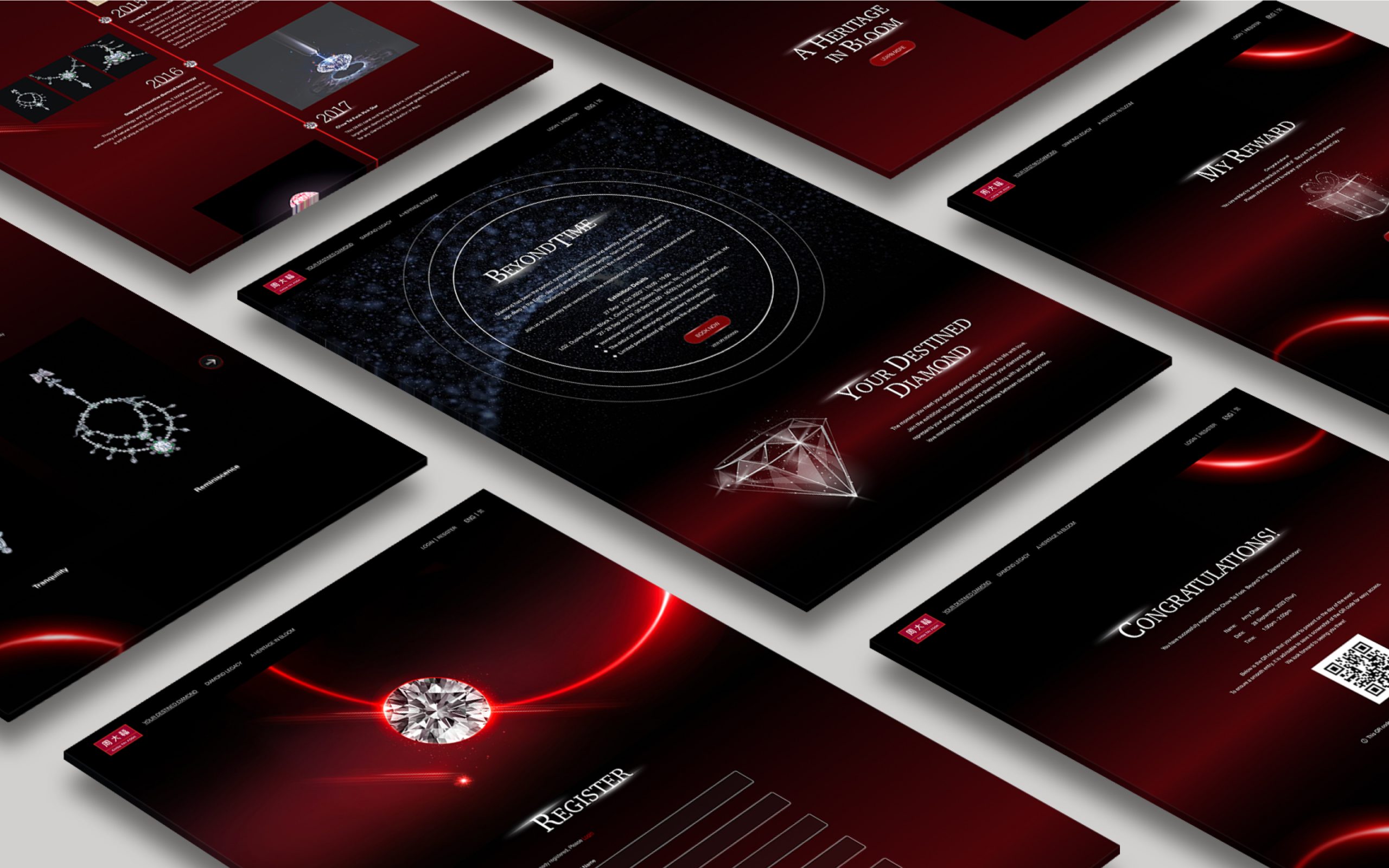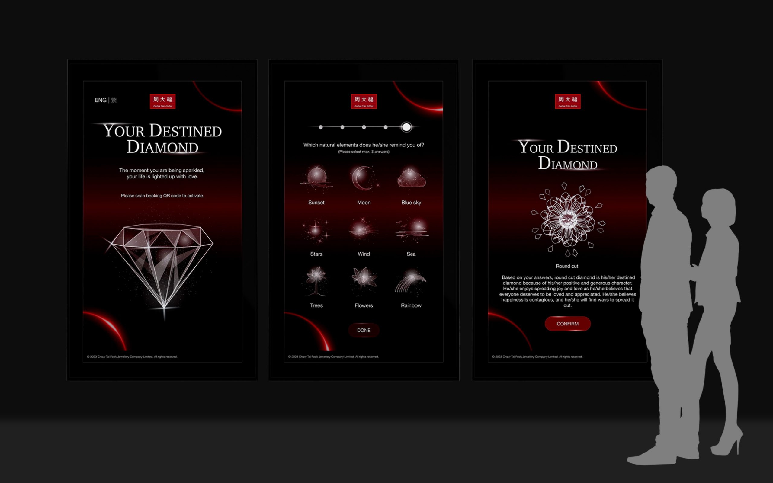 To let customers experience a journey that ventures into the mesmerizing life of incredible natural at Chow Tai Fook, a campaign site with RSVP feature. Customers can create their destined diamond on touch screen kiosks, and scan QR code to download/share their unique diamond pattern, and receive personalized leather box as a gift.