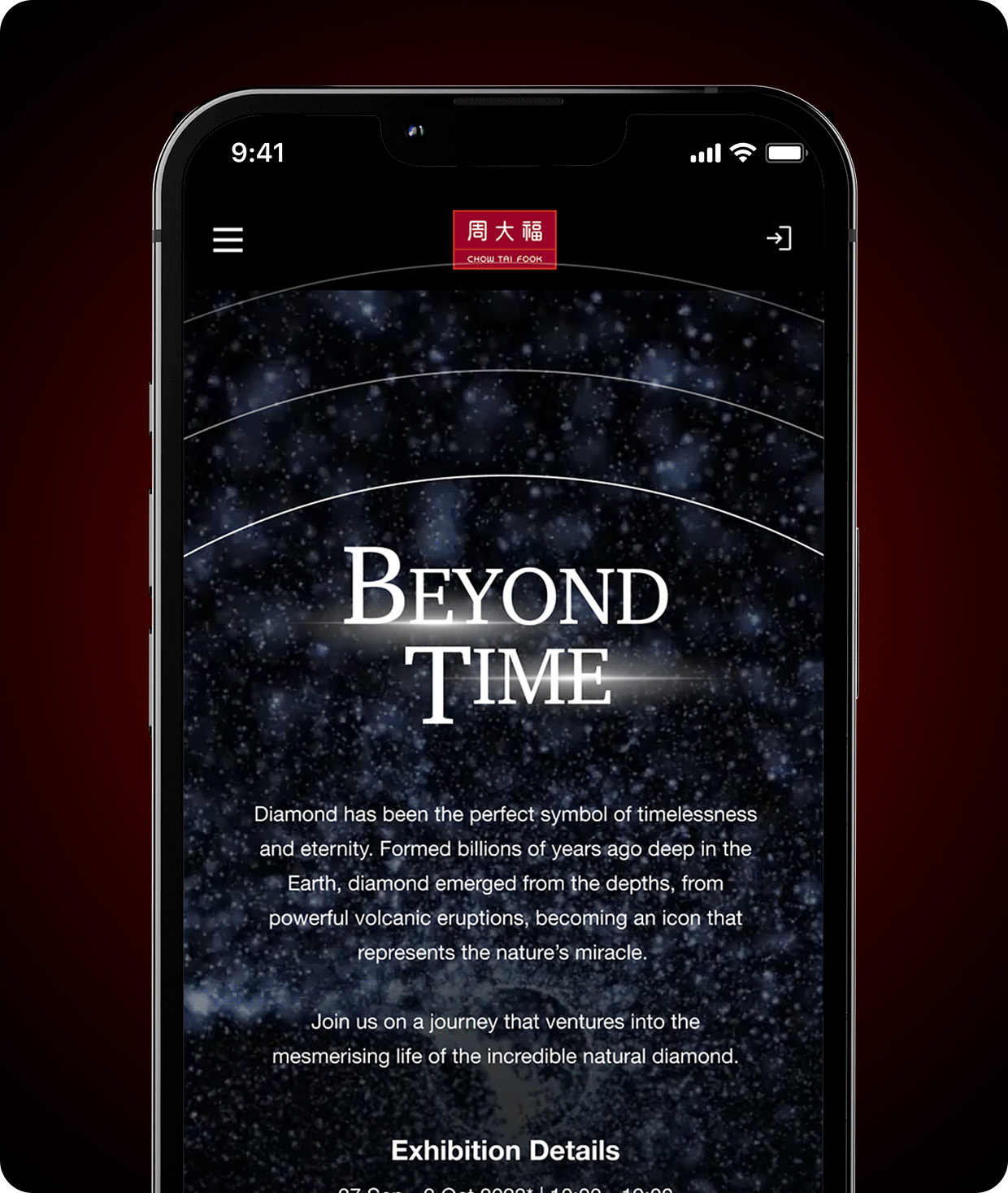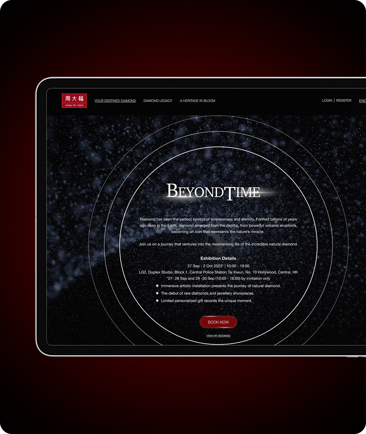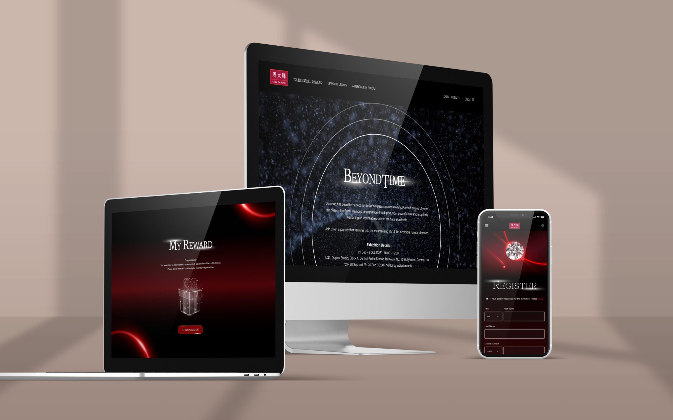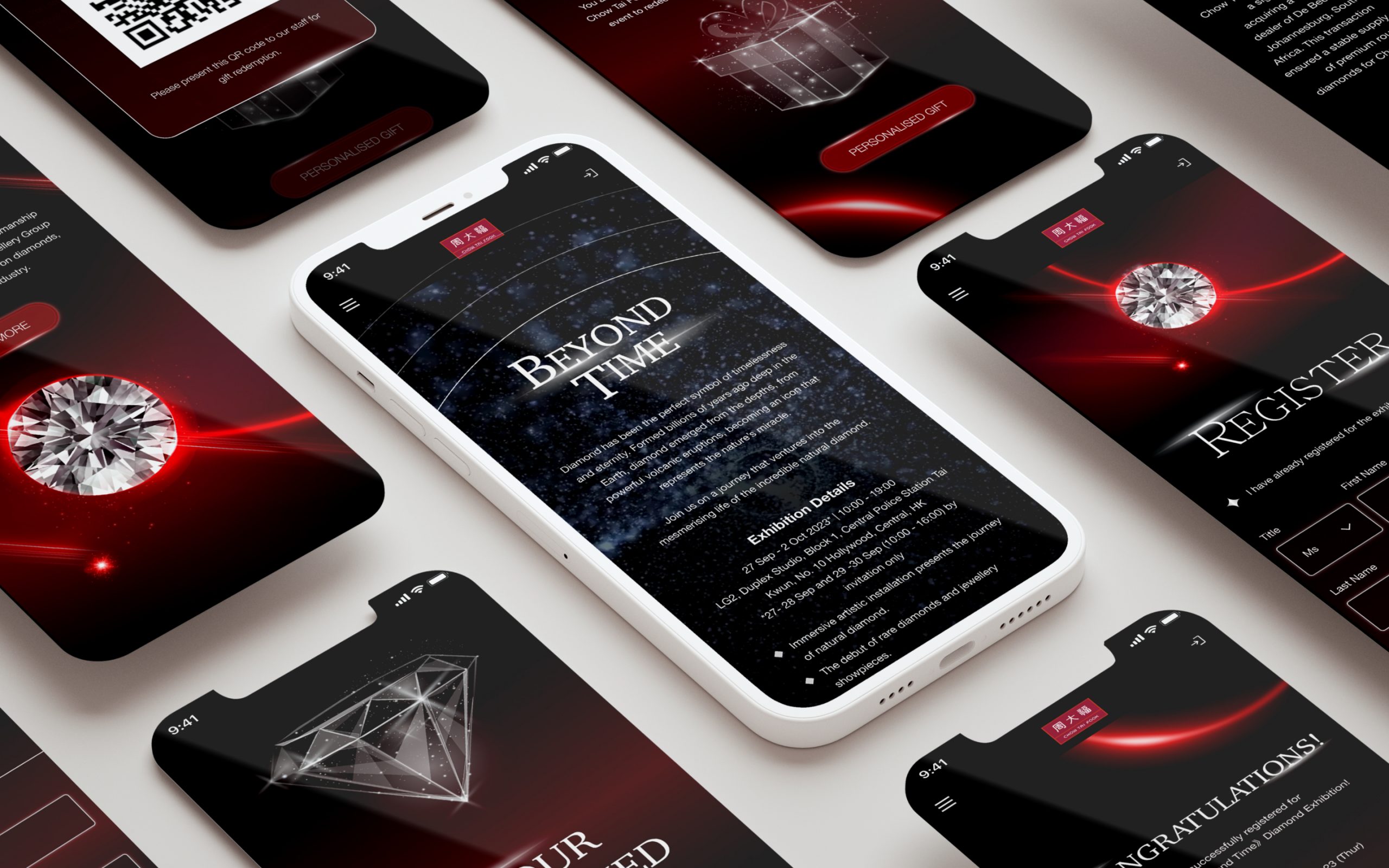 To let customers experience a journey that ventures into the mesmerizing life of incredible natural at Chow Tai Fook, a campaign site with RSVP feature. Customers can create their destined diamond on touch screen kiosks, and scan QR code to download/share their unique diamond pattern, and receive personalized leather box as a gift.